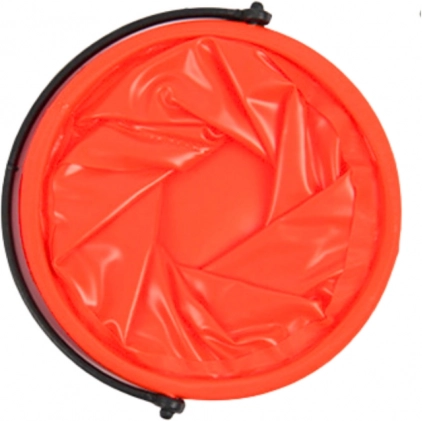 A narancssárga összecsukható vödör könnyen laposra hajtható, ami megkönnyíti tárolását és szállítását.