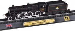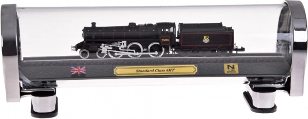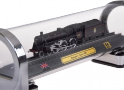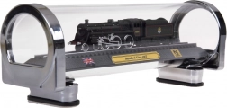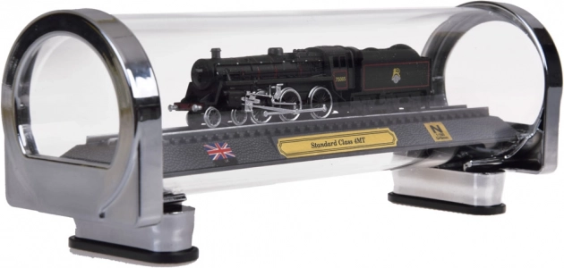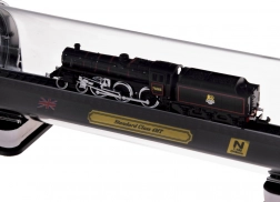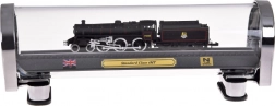 Ez a részletgazdag, brit STANDARD CLASS 4MT gőzmozdony modell ideális választás vasútrajongóknak és stílusos dekorációk kedvelőinek egyaránt. A precíz 1:160 méretarányú kivitel kiemeli az autentikus részleteket, a kontrasztos festést és a finom kerékvonalazást. A modell sínszakaszra rögzítve, elegáns talapzaton áll, plakettel, brit zászlóval és a méretarány feltüntetésével.