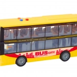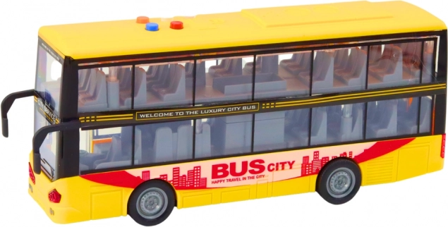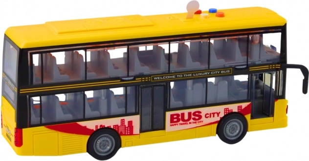 Az ikonikus sárga színű busz hűen utánozza a valódi turistás emeletes járművet. A gyerekek működtethetik a dudát, a motorhangot, és figyelhetik a villogó fényeket, ami fokozza a játék valósághűségét. A lendkerekes meghajtás egyenletes haladást biztosít – elég finoman meglökni, és a busz elindul.