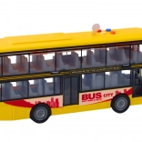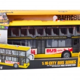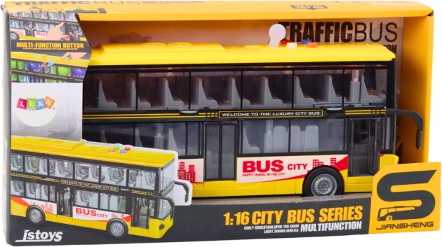 Élethű, 1:16 méretarányú kétszintes busz, amely örömet szerez a városi járművek kis rajongóinak. Fény- és hangeffekteket, lendkerekes meghajtást és nyitható ajtókat kínál. Tartós műanyagból készült, élénk sárga színe miatt ideális a fantáziadús játékhoz otthon és útközben is.