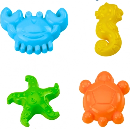 A csomagban 9 darab található: vár–vödör, malom, lapát, gereblye, 4 forma (rák, tengeri csikó, csillag, teknős) és szita. A készlet remekül fejleszti a gyerekek fantáziáját, a csapatjátékot és az érzékelést. A CE tanúsítvány és az EN71 szabványnak való megfelelés biztosítja a biztonságos használatot.