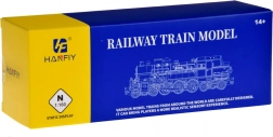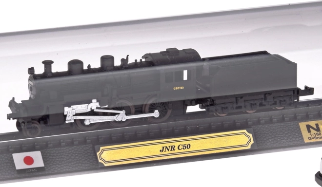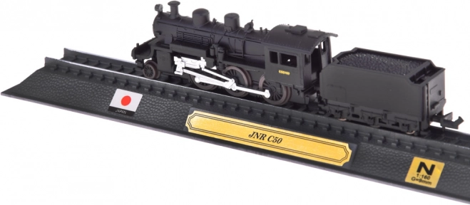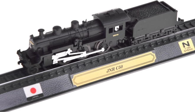 Részletes JNR C50 gőzmozdony-modell 1:160 méretarányban, valósághű karosszéria- és futóműelemekkel, sínes alaplapon.