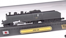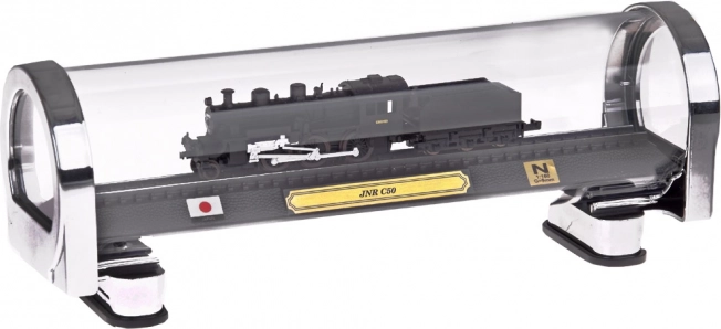 Fedezze fel a stílusos gyűjtői kiegészítőt: a JNR C50 gőzmozdonyt pontos 1:160 méretarányú reprodukcióban. A modell valósághű sínes alaplapon kapott helyet, név- és méretarány-táblával, kiegészítve az ország zászlajával. A hengeres vitrin átlátszó, vastag műanyaga részletgazdag megtekintést tesz lehetővé, miközben véd a portól és ütődésektől.