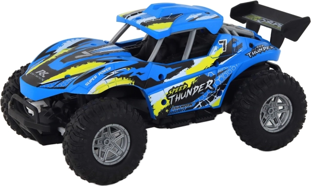 Ez a nemcsak gyerekeknek szánt terepjáró autó kertben és lakásban egyaránt szórakoztató. A nagy, mélyen bordázott kerekek remek tapadást biztosítanak, a hátsókerék-meghajtás pedig dinamikát és lendületes rajtokat ad a modellnek. A sportos kék dizájn látványos grafikákkal első pillantásra magával ragad.