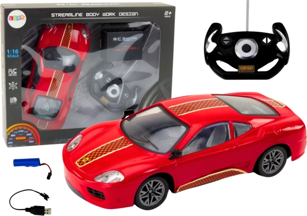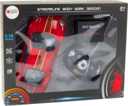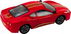 A piros távirányítós autó fekete és narancs részleteivel olyan valódi sportautót idéz, amelynek aerodinamikai kialakítása van.