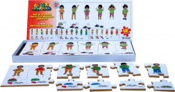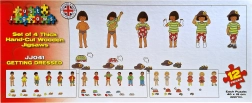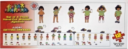 A Just Jigsaws fa puzzle készlete négy figurát mutat be, akiket a gyerekek fokozatosan öltöztetnek fel, ezáltal játékos formában gyakorolják a logikus gondolkodást és a ruhadarabok neveit.