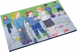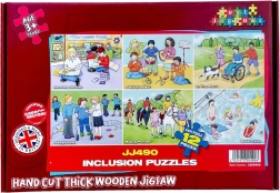 Fedezze fel a oktatási puzzle-kat 72 darabbal, amelyek jeleneteket ábrázolnak, ahol fogyatékkal élő egyének vesznek részt mindennapi tevékenységekben. Minden kép az integráció és a kölcsönös segítségnyújtás gondolatát támogatja. Ezek a puzzle-k segítenek a gyerekeknek megérteni az egyenlőséget, empátiát és tiszteletben tartani mások különbözőségeit.