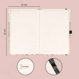 Elegáns, vonalas jegyzetfüzet kemény borítóval és praktikus gumis zárással. Található rajta tollhurok, belső zseb apróságoknak, valamint 172 pontozott oldal sárga papíron ötletekhez, naplóíráshoz és munkajegyzetekhez.