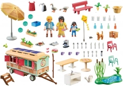 Ez a készlet bármely alkalomba megfelelő ajándék, motiválja a gyerekeket a kreativitásra és segíti őket értékes készségeik fejlesztésében. A készlet tartalmaz három Playmobil figurát, két libát, ülőhelyes járművet két székkel és asztallal, virágtartókat és sok más kiegészítőt. A kocsi belseje díszíthető a mellékelt matricákkal.