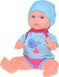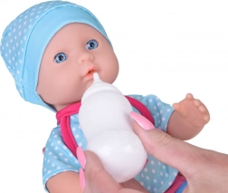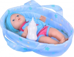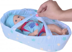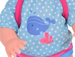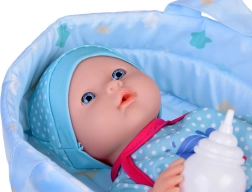 Ez a készlet mindent tartalmaz, amire a kis szülőknek szükségük van a babáik ápolásához - valósághű vonásokkal rendelkező baba, könnyű hordozást biztosító hordozó és etetéshez cumisüveg. A baba kék szemű, kék ruhában van, bálnás mintával, ami növeli a játék hitelességét a gyermekgondozásban. Az üveg után a baba tud 'pisilni', ami nemcsak játékszer, hanem a kicsik tanulásának szórakoztató eszköze is.