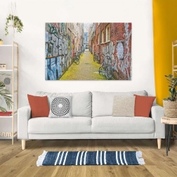 Az utcácska graffiti falakkal és kerékpárokkal egy változatos, dinamikus képet alkot, amely első pillantásra megragad, és összeállítva remekül díszíti a belső tereket.