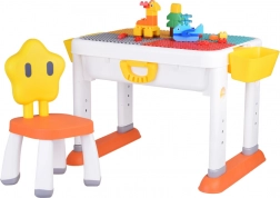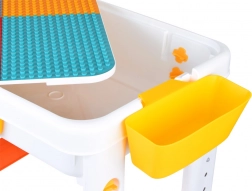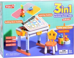 Multifunkciós 3 az 1-ben gyermekasztal állítható magasságú lábakkal, kétoldalas lappal építőkockákhoz és íráshoz, valamint praktikus tárolóhellyel. A csomagban kényelmes szék is található stabil lábakkal. Ideális játékhoz, tanuláshoz és étkezéshez – minden egy helyen. Kétoldalas lap, állítható magasság, tárolódoboz, 55 kocka a készletben és csúszásgátló elemek a biztonságos használathoz.