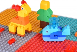 Az egyik oldal bütykökkel az építőkészlethez, a másik sima rajzoláshoz, tanuláshoz és társasjátékokhoz – minden egy helyen.
