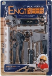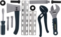 A készlet körülbelül 13 darab szerszámot tartalmaz, mint például kulcs, fogó és csavarhúzó, amelyeket a gyerekek használhatnak valós szerelési munkák szimulálására.