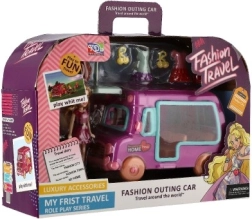Rózsaszín autót mintázó játék, amely ideális a babák divatbemutatókra történő utazására, fejleszti a képzelőerőt és a történetalkotást.