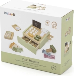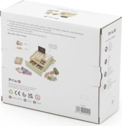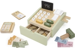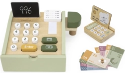 A kellemes zöld színű fa pénztárgép nagyszerű fejlesztő játék 3 éves kortól. Működő elemei, mint a kihúzható fiók, gombok, szkenner, kártyaterminál és papírtekercs hűen utánozzák az igazi kasszát. A csomagban kétoldalas mini tábla is található a számlák feljegyzéséhez.