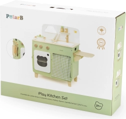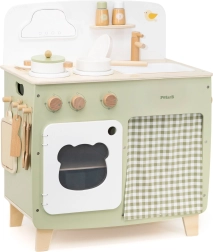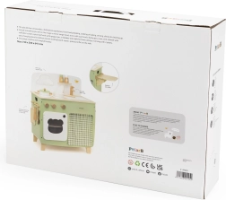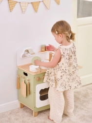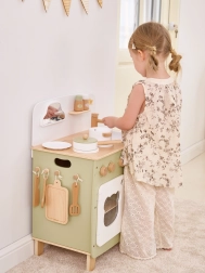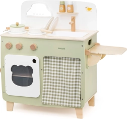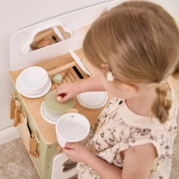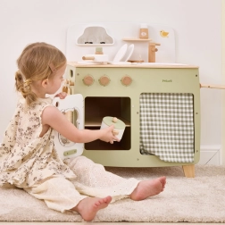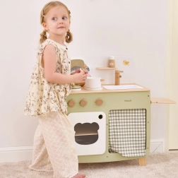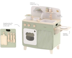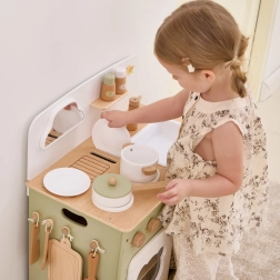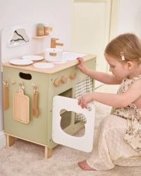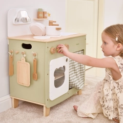Stílusos gyerekkonyha kellemes természetes és zöld árnyalatokban, amely valósághű főzőélményt kínál. A masszív fa kivitelnek, a forgó gomboknak, a mosogatónak és a sütőnek köszönhetően a kis szakácsok órákig élvezhetik a biztonságos és kreatív játékot. A praktikus lehajtható oldalsó pult megnöveli a munkafelületet szeleteléshez vagy étkezéshez, míg a függönyös szekrény minden kincset elrejt.