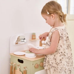 A tűzhely és a sütő forgó gombjai, a csappal ellátott mosogató, a felszereléshez való akasztók és a fűszertartók segítik az utánzó játékot és a finommotorikát.
