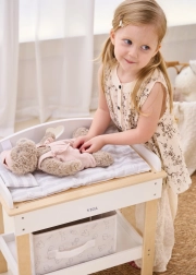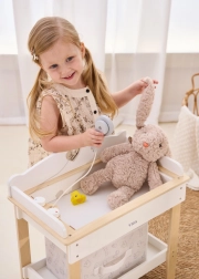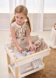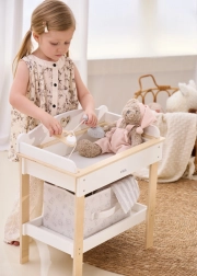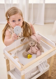 A strapabíró fa szerkezet biztonságos és stabil játékot garantál. A letisztult, természetes és fehér tónusok könnyen illeszkednek a modern enteriőrbe. A szett ideális szerepjátékhoz, fejleszti a finommotorikát, az empátiát és a felelősségérzetet, babákhoz akár 43 cm-es méretig.