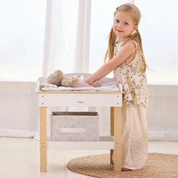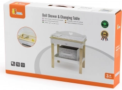 Ez a multifunkciós készlet a VIGA márkától lehetővé teszi a gyerekek számára, hogy valósághűen játsszák el a babagondozást. A felső lap kényelmes pelenkázó felületként szolgál; a lap eltávolítása után zuhanyfejes babakáddá alakul a vízi rituálékhoz. Az alsó polc textilkosárral mindent rendezetten és kéznél tart.