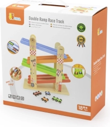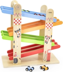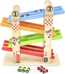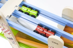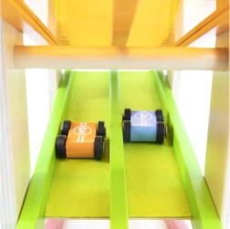Ez a masszív fa pálya dupla rámpát kínál, így egyszerre két kisautó izgalmas versenye lehetséges. A gyerekeket lenyűgözi a színes kivitel és a célba helyezett csengők hangja, amelyek a járművek befutásakor szólalnak meg. A konstrukció a kis kezekhez igazodik – sima élek, stabil alap és tartós anyagok biztosítják a hosszú élettartamot és a biztonságos játékot.