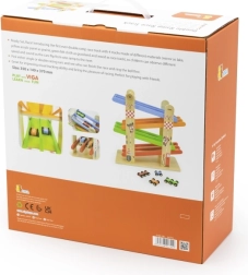 A Viga vidám, fa, dupla sávos versenypályája végtelen futamokat és mozgás örömét kínálja a gyerekeknek. A két párhuzamos sáv lehetővé teszi két kisautó egyidejű párbaját, a célban pedig csengők köszöntik a befutókat. Tartós, lakkozott fa kivitel, éles élek nélkül, nem mérgező festékekkel, így biztonságos a kis kezeknek. A csomagban 4 színes kisautó található két kivitelben (4 és 6 kerekű), amelyek támogatják a finommotorikát, a kéz–szem koordinációt, és játékosan ismertetik meg a fizikai elveket.