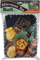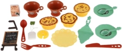 A készlet csészéket, tányérokat, evőeszközöket, egy kis desszertet és feliratos táblácskát tartalmaz – minden adott a stílusos tálaláshoz és a társas játékhoz.
