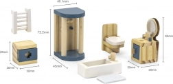 Természetes fa kék részletekkel és gondosan kidolgozott elemekkel (zuhanyzó, WC, mosdó, szekrény), amelyek autentikus megjelenést adnak és ellenállnak a gyakori játéknak.