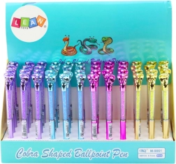 Ez a stílusos golyóstoll a felső részen elhelyezett egyedi kobra figurával és a mozgásra szikrázó, apró „gyémántokkal” töltött átlátszó testtel hívja fel magára a figyelmet. A 0,7 mm-es kék betéttel gördülékenyen és jól olvashatóan ír, így ideális iskolába, irodába és otthonra is.