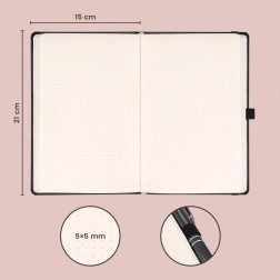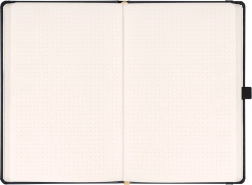 A pöttyözött rács rugalmasságot kínál íráshoz, rajzoláshoz és áttekinthető tervek készítéséhez. A felület emellett alkalmas logó prégelésére, így a jegyzetfüzet könnyen stílusos céges ajándékká vagy prezentációs anyaggá alakítható.