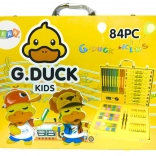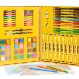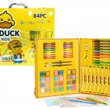 A készlet egy bájos sárga bőröndben kapott helyet, amely nemcsak élénk színével vonzza a tekintetet, hanem kacsás motívumával is kitűnik. Ennek a vidám grafikának köszönhetően a bőrönd biztosan kedvelt társ lesz az alkotó kalandok során.