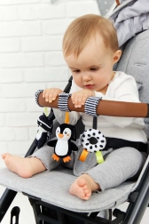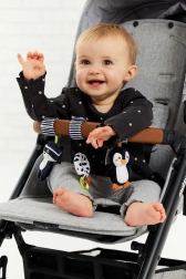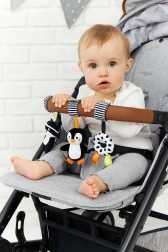 A játék könnyen rögzíthető különböző felületekre, mint babakocsi, kiságy vagy autósülés, így ideális társ lehet útközben és otthon is.