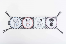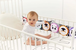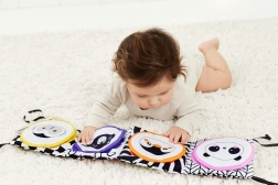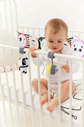 A könyv egyik oldala állatos kontrasztos illusztrációkat kínál hímzett elemekkel, amelyek segítik a gyermek látásának és tapintásának serkentését.