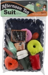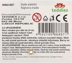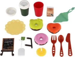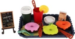A szett része egy dekoratív kék tálca, kávéscsésze, kis kancsó, palack/pohár, tejes doboz, evőeszközök és különféle édes finomságok. A készlet remekül fejleszti a szociális készségeket, a kommunikációt és a fantáziát a közös játék során.