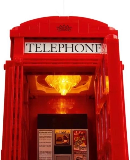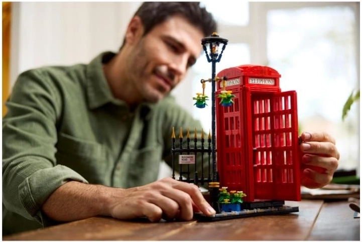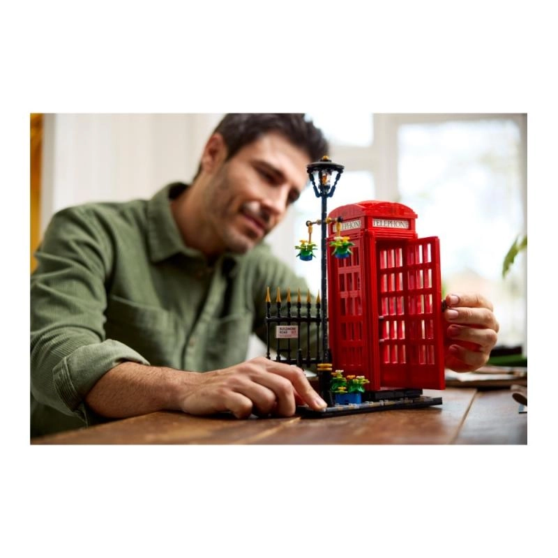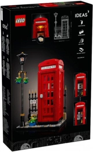Fedezze fel London varázsát a LEGO Ideas piros brit telefonfülkéjének kiállítási modelljével. Élvezze a pihentető építést, válasszon a kétféle telefon közül (tárcsás vagy 90-es évekbeli stílus), és ragyogtassa be a jelenetet a fénykockával, amely a tető megnyomásával aktiválható. A készlet része egy autentikus londoni minijelenet lámpával, kerítéssel és virágokkal – ideális dekoráció és telefonállvány is.