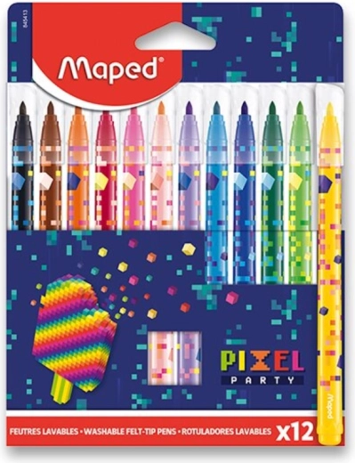 Vidám készlet 12 színes filctollal MAPED Pixel Party sorozatból, amely élénk színeket és játékkódok által inspirált, szórakoztató dizájnt kínál. A filcek légáteresztő kupakkal rendelkeznek a biztonságos használatért, ellenálló heggyel a benyomódás ellen, valamint kimosható tintával, amely a legtöbb textilből könnyen eltávolítható. A 2,8 mm vonalvastagság ideális rajzoláshoz, színezéshez és iskolai projektekhez.