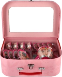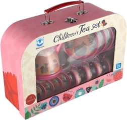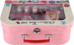 A teáskészlet masszív, füllel és fémzárral ellátott bőröndben kapott helyet. A gyerekek bárhová magukkal vihetik, és játék után könnyen elpakolhatják.