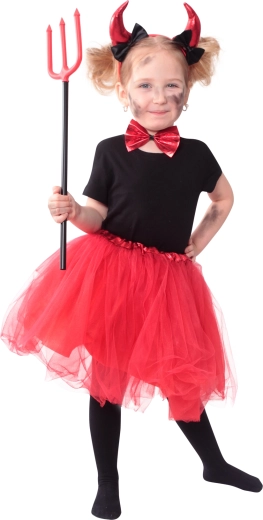 Aranyos jelmez kis ördöglányoknak 3–7 éves korig, pelyhes tüll TUTU szoknyával és ördögfarkkal, kényelmes rugalmas derékkal, valamint kiegészítőkkel: szarvas fejpánttal és nyakra való csokornyakkendővel. Ideális Halloweenre, farsangra és tematikus bulikra.