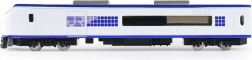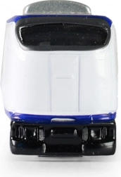 Fehér kivitel kék részletekkel és letisztult vonalakkal, amelyek kiemelik a mozdony modern megjelenését – játékhoz és kiállításhoz egyaránt ideális.