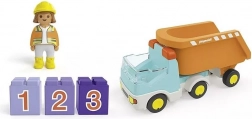 Ez a színes építőkészlet lenyűgözi a kis sofőröket és a leendő építésvezetőket. A gyerekek az „köveket” a plató nyitott hátsó részén át rakodhatják fel, a billenthető felépítménnyel kiüríthetik a rakományt, majd újra és újra megismételhetik a szórakoztató rakodási ciklust. A három számozott kocka (1, 2, 3) természetes módon fejleszti a számolás alapjait és a színrendezést.