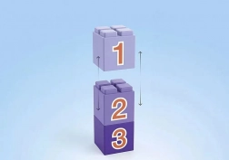 Három, egymásra rakható kocka 1, 2 és 3 számmal támogatja a korai matematikai műveltséget, a válogatást és a toronyépítést.