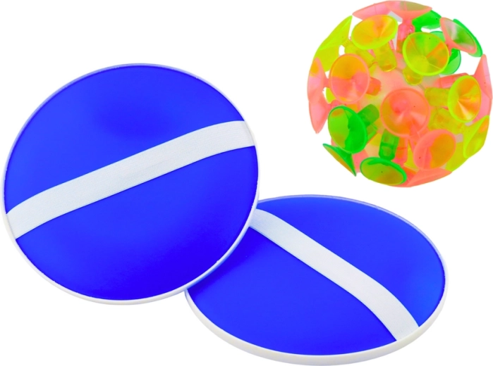 A játék tartalmaz két kerek kék ütőt tapadókorongokkal és egy könnyű labdát, ideális a dinamikus szabadtéri játékhoz.