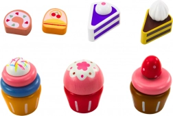 A készlet minden eleme kiváló minőségű fából készült, ami tartósságot és masszivitást biztosít a játéknak. A fa „édességek” élénk, vonzó színekben pompáznak, amelyek felkeltik a figyelmet és ösztönzik a kreatív játékot. A szett ideális konyhai szerepjátékokhoz, fejleszti a gyerekek fantáziáját és kézügyességét.