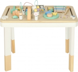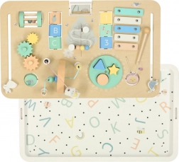 A xilofon, a formabedobó, a fogaskerekek csúszkákkal és a gyöngylabirintus sokáig lefoglalja a gyerekeket, és természetes módon fejleszti a finommotorikát és a logikát.