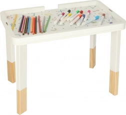 Az asztalka minőségi fából készült, lekerekített élekkel, és nem toxikus festékekkel van lakkozva. Megfelel az európai biztonsági előírásoknak (CE). A praktikus lapnak köszönhetően kiváló íráshoz, rajzoláshoz és kreatív alkotáshoz is.
