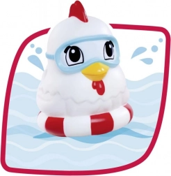 A puha vinil figurák kellemes tapintásúak, és ideálisak vízben való játékhoz. A csibe úszógumiban lebeg, és további játékra csábít a kádban.