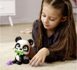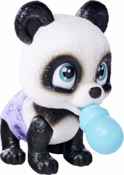 A panda az üvegcséből iszik, majd bepisil a pelenkába, ami nedvesség hatására sárgává változik, így autentikus játékélményt nyújt.