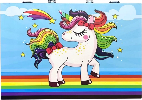 Az elegáns, kék színű kis bőröndben található, bájos egyszarvús motívummal díszített alkotókészlet ideális választás a kis művészeknek, akik szeretnek alkotni. A bőrönd nemcsak praktikus, hanem esztétikus is, tökéletes a szükséges kiegészítők tárolására és szállítására, így gyermeked könnyedén magával viheti alkotóeszközeit bárhová, ahová a fantáziája vezeti.