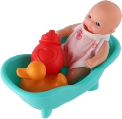 Ez a színes fürdőkészlet babával kiváló a mindennapi játékhoz. A masszív műanyag testnek köszönhetően a baba tartós és könnyen karbantartható. A kád és az apró kiegészítők, mint a cumisüveg és a kacsa, támogatják a kreatív játékot és a finommotorika fejlődését.