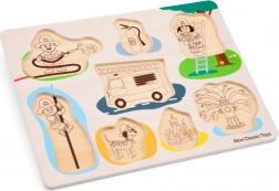 A beillesztő nyolc darabot tartalmaz, mindegyik saját nyílással és fogóval a könnyű megfogáshoz. Minden darab alatt van egy kép, amely segíti a gyerekeket a megfelelő hely megtalálásában.